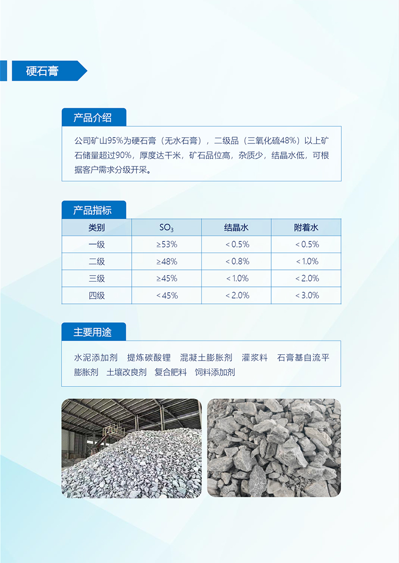 硬石膏是一种硫酸盐矿物,它的成分为无水硫酸钙,与石膏的不同之处在于它不含结晶水。在潮湿的环境下硬石膏就会吸收水分变成石膏。本公司天然无水硬石膏矿石属天然无水硫酸钙(CaSO4),品味高,质量稳定。我公司依据ISO9001:2000国际质量管理体系标准进行质量控制,所生产的石膏矿石,广泛应用于建材、化工、农业等领域,产品畅销全国各省市,并出口韩国、日本等地区。