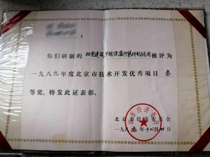 抹灰石膏(粉刷石膏)是二水硫酸钙经脱水或无水硫酸钙经煅烧和/或激发,其生成物半水硫酸钙和Ⅱ型无水硫酸钙(CaSO4·1/2H2O和Ⅱ型CaSO4)单独或两者混合后掺入外加剂制成的抹灰材料。上个世纪八十年代末,原北京市建筑材料科学研究所(现北京市建筑材料科学研究总院)对石膏类抹灰材料粉刷石膏(现成为抹灰石膏)进行了研究,取得相应的科研成果并得到了推广应用,如下图,为当时所取得的证书: